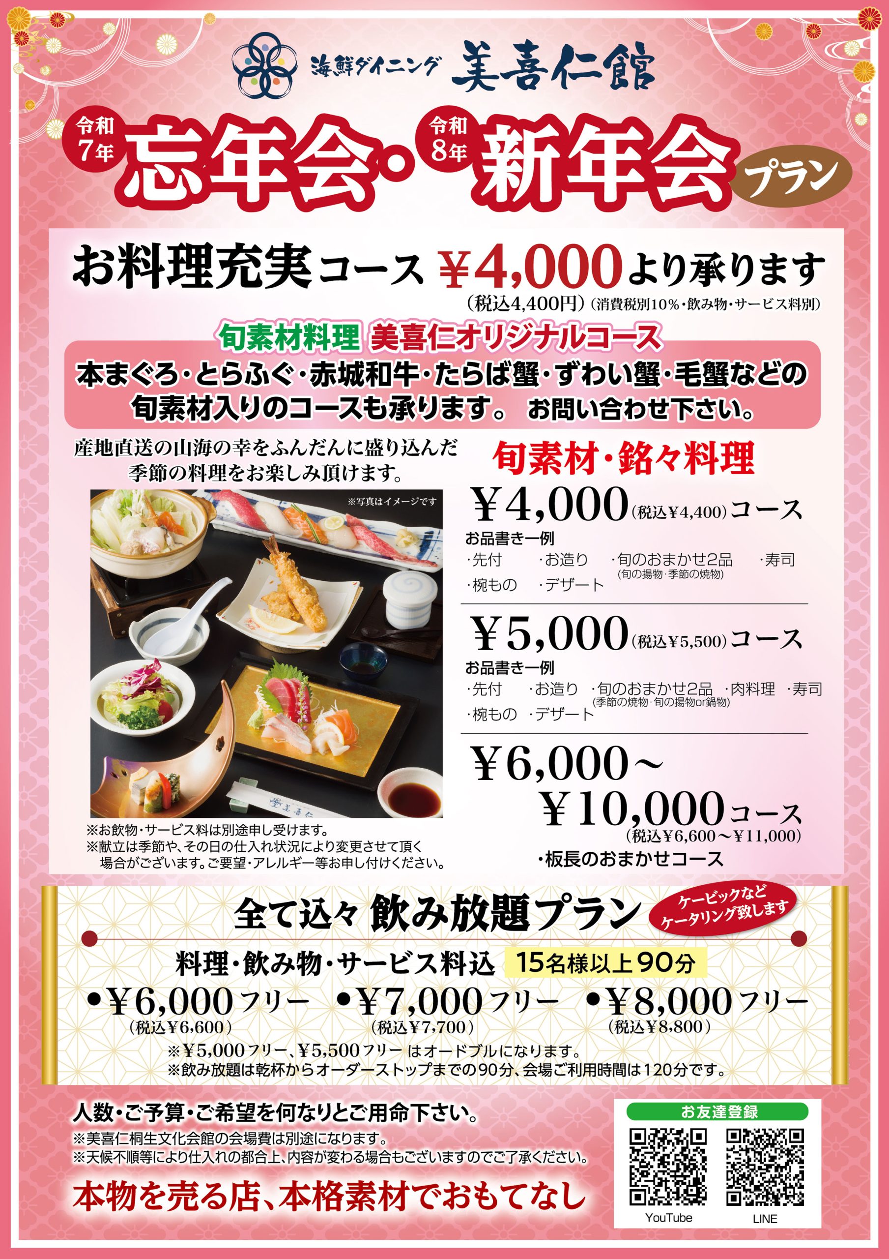 高崎 太田 桐生 忘年会 新年会 プラン 2025年11月24日 掲載 美喜仁本店 美喜仁館 高崎店・太田店・桐生店の 忘年会 新年会 各種ご宴会プランです ご予約おまちしております お気軽にお問い合わせください