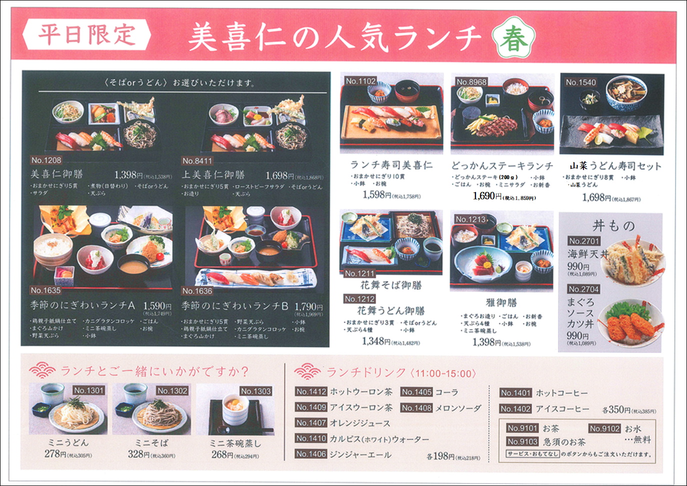 高崎 太田 桐生 2026 春ランチメニュー 2026年03月24日 掲載 美喜仁館 高崎店 太田店 桐生店の 春のランチメニューです! にぎわいランチ春ver' は 鶏親子鍋や海鮮ぬた などで賑わっています! 山菜うどんとお寿司のセットもありますよ! 春のおでかけの際は 美喜仁館でランチを!